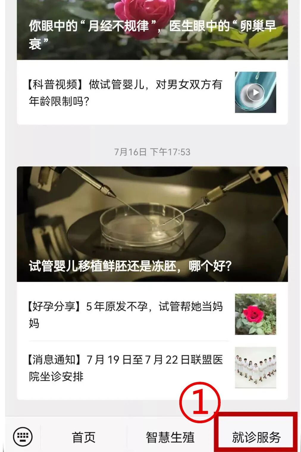 1、關(guān)注中心微信公眾號(hào)(四川省人民醫(yī)院生殖中心)。申請(qǐng)電子就診卡(以本部為例)。