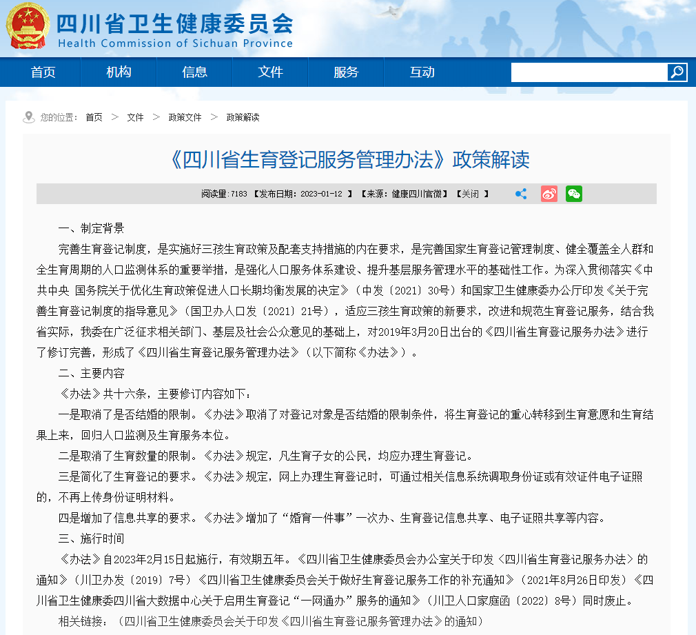 近日,四川省衛(wèi)生健康委發(fā)布關(guān)于《四川省生育登記服務(wù)管理辦法》2月15日起四川生育登記取消結(jié)婚限制的取消消息引起了網(wǎng)友的熱議。