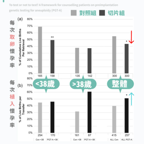 以取卵來計算累積懷孕率時,切片組整體累積懷孕率下降了,大約下降20%,尤其以38歲以下的年輕族群胚胎耗損率尤其明顯。